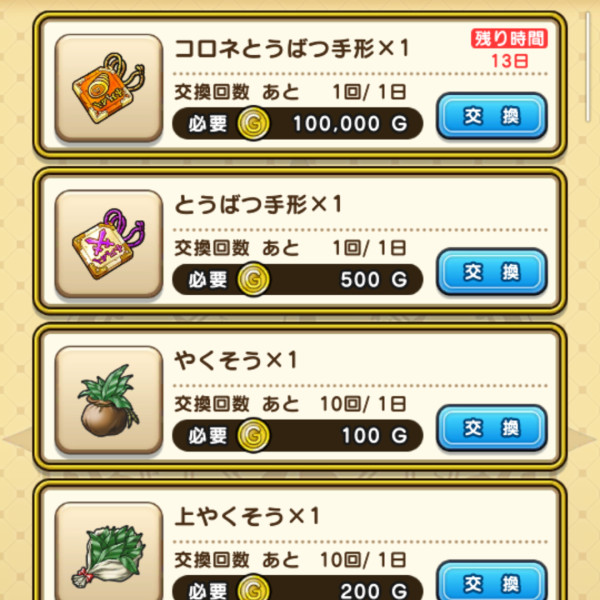 入手方法①交換所で10万ゴールドと交換(毎日1枚)