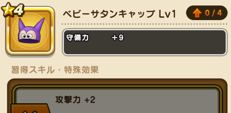 ドラクエウォークの防具「ベビーサタンキャップ」の評価や習得スキル・特殊効果をまとめています。