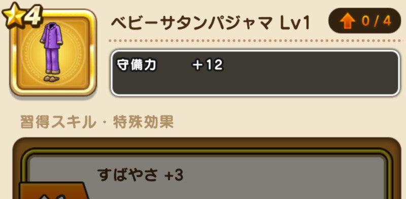 ドラクエウォークの防具「ベビーサタンパジャマ」の評価や習得スキル・特殊効果をまとめています。