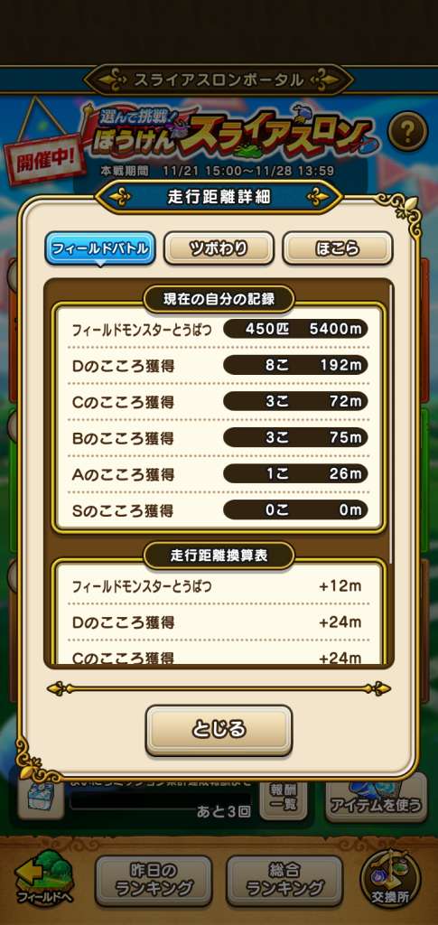 スライアスロンの「走行距離詳細」の記録を利用して、こころのドロップや心珠の生成の募集ができそうだったため、お試しで実施致しました。