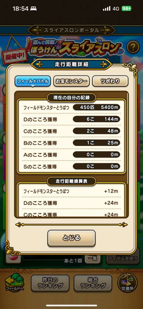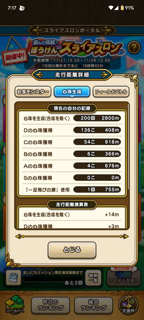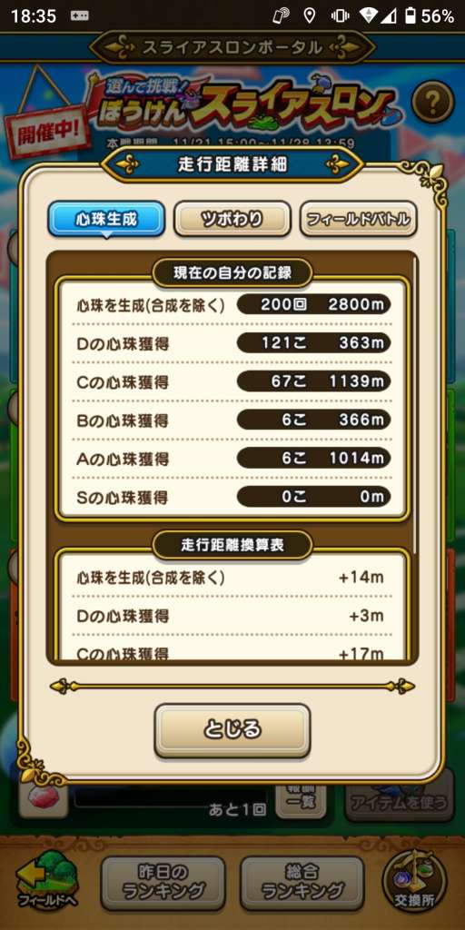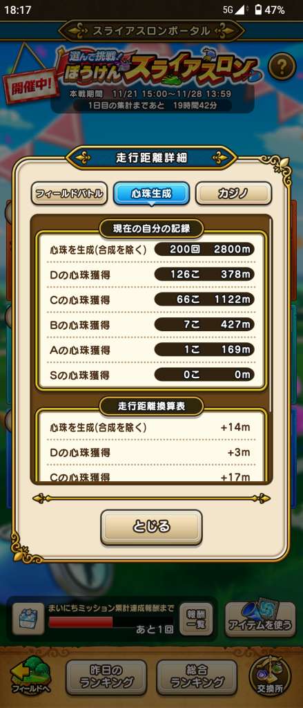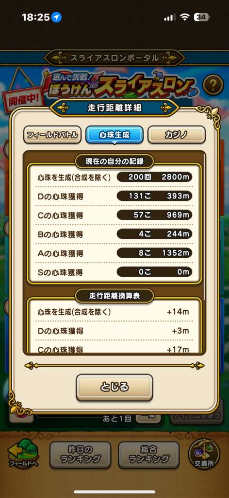 ドラクエウォークのスライアスロンの「走行距離詳細」の記録を利用した、こころのドロップ率や心珠の生成率を集計しまとめています。