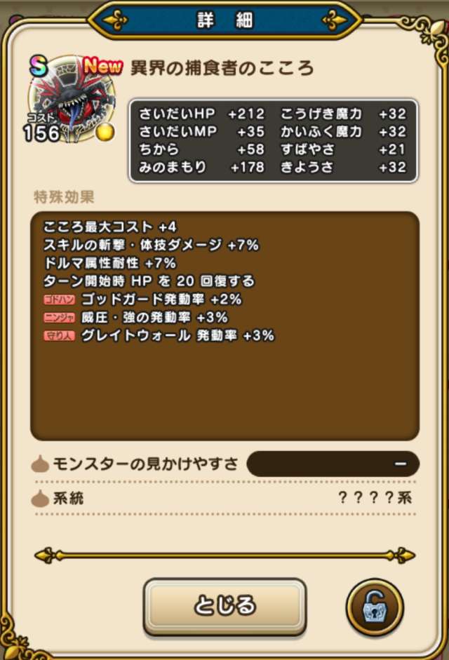 | こころ最大コスト+4 スキルの斬撃・体技ダメージ+7% ドルマ属性耐性+7% ターン開始時HPを20回復する ゴッドガード発動率+2%【ゴドハン】 威圧・強の発動率+3%【ニンジャ】 グレイトウォール発動率+3%【守り人】 | ||||