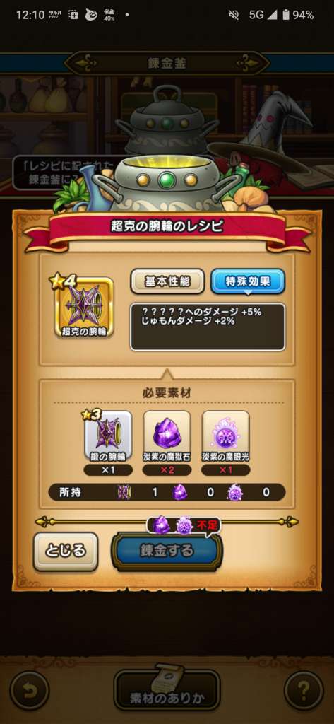 ![]() 変異の腕輪 | ・かいふく魔力+10 ・エスタークとの戦闘時スキルHP回復効果+3% ・スキルHP回復効果+1% |