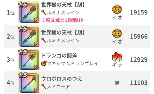 イオ130%の相手だと初っぱなからメドローアの倍近いダメージが出て、フォースブレイクでさらにダメージが延びて、よい効果の延長やバフ剥がし、バギは回復も備わっている天杖を取ってから、メドローアはほぼ使わなくなりました。