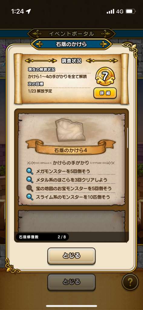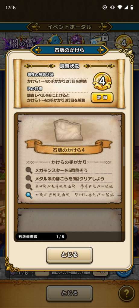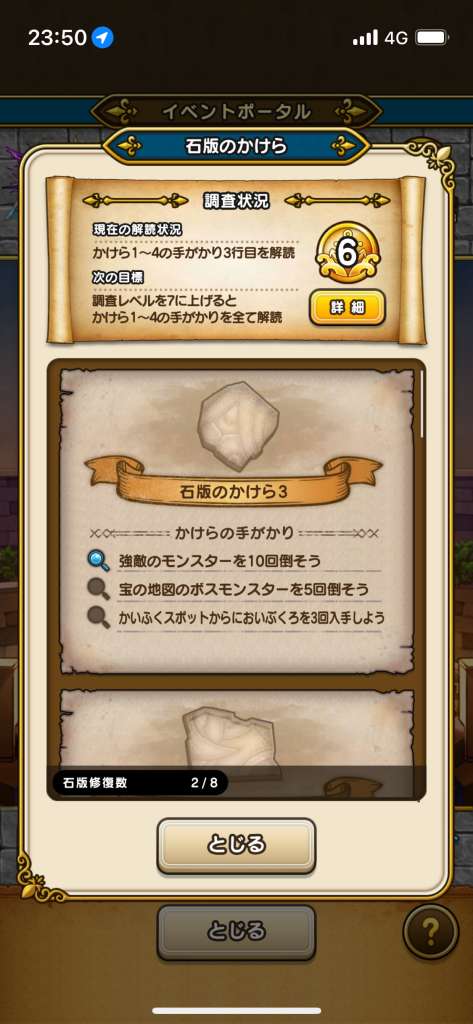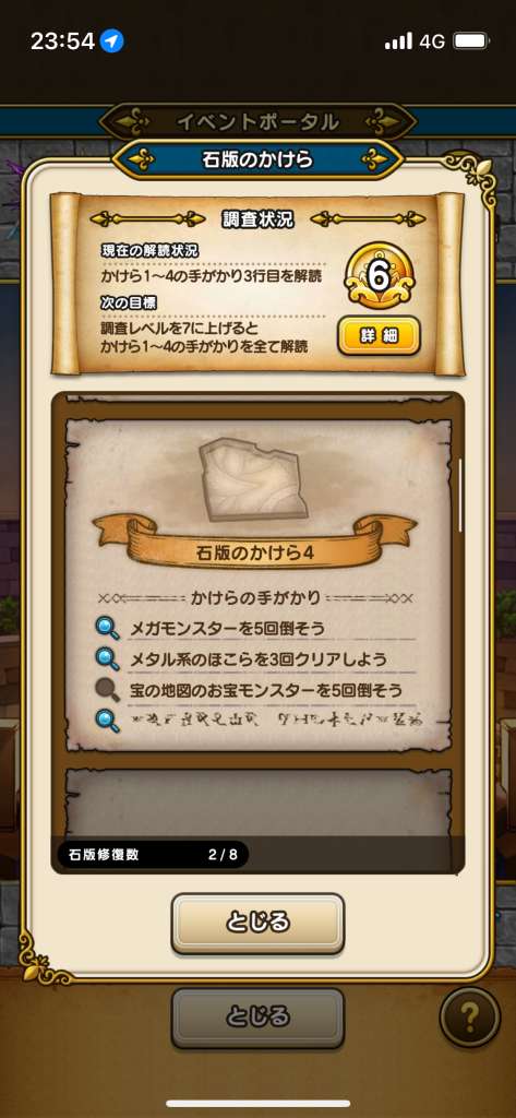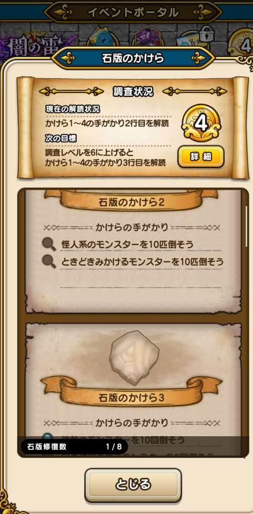 石版を集めるための手がかりを読むために、まずは調査レベルを上げる必要があります。