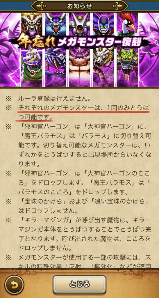 ドラクエウォークの年末/年忘れメガモン復刻の弱点倍率と攻略、こころを一覧にしてまとめています。2024に登場したメガモンスターが対象です。