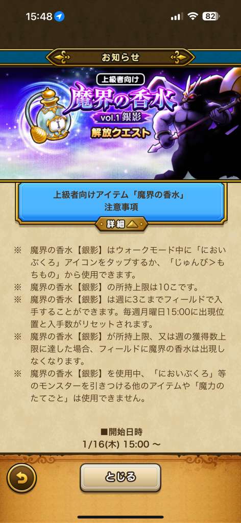 常設のコンテンツです。「魔界の香水」は、使用することで特別なモンスターが出現するアイテムとなります。