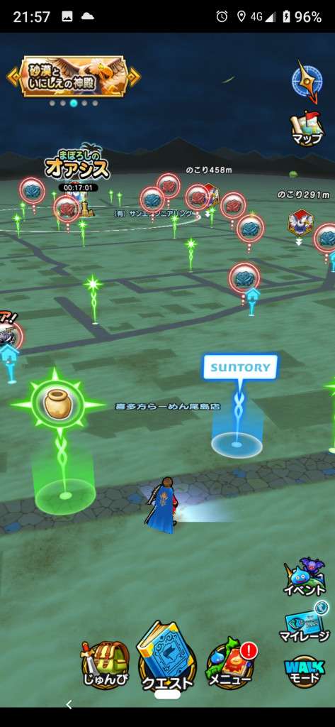 期間中、サントリーの自販機のある場所がドラクエウォーク内のかいふくスポット(ツボ)に変化します。ゲーム内のマップでは画像のように青く光っている場所が目印。全ての自販機が対象ではないが、前回のコラボよりも約3倍増加しています。