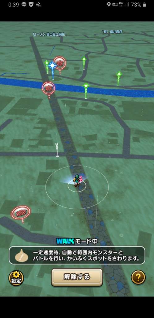 期間中、サントリーの自販機のある場所がドラクエウォーク内のかいふくスポット(ツボ)に変化します。ゲーム内のマップでは画像のように青く光っている場所が目印。全ての自販機が対象ではないが、前回のコラボよりも約3倍増加しています。