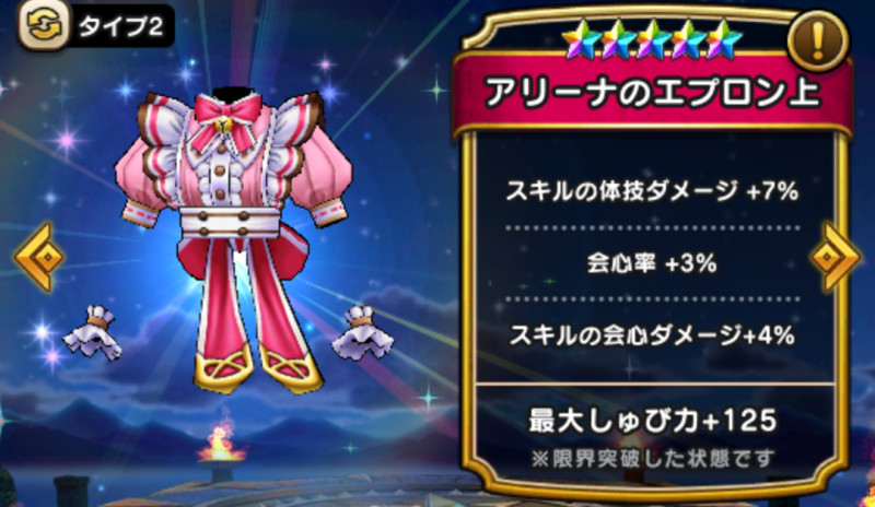 ドラクエウォークの防具「アリーナのエプロン上」の評価や習得スキル・特殊効果をまとめています。