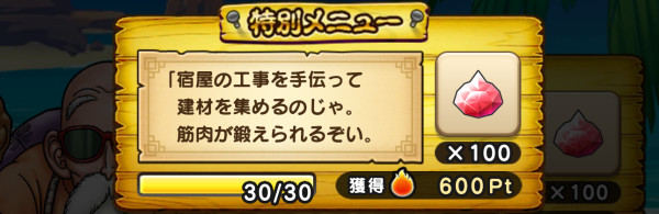 | 宿屋の工事を手伝う ツボ割り(確率) 家のキラキラ(確率) | 600pt | ジェム×100 |