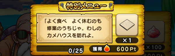 | カメハウスを訪れる 悟空モードでも可 | 600pt | 天下一武道会のゆか×1 |