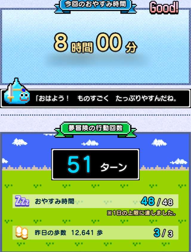1日に進められるのは最大51ターンなので、最短クリアでも15時起点で32時間+1万歩(2日目)が必要になります。
