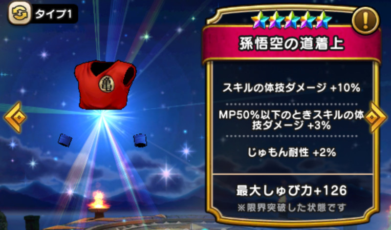 ドラクエウォークの防具「孫悟空の道着上」の評価や習得スキル・特殊効果をまとめています。