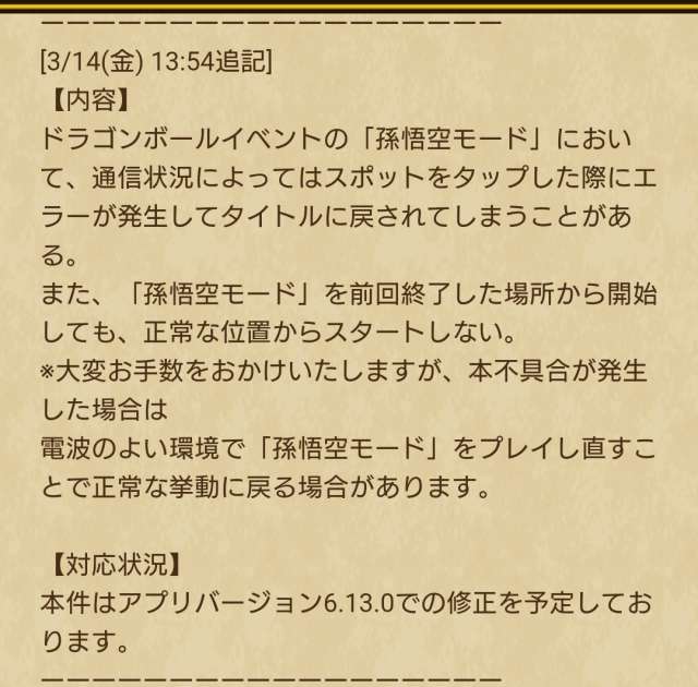 3/13(木)10:00頃に配信されたバージョン6.12.2で修正が完了したようです。アプデすることで悟空モードが使用可能になります。