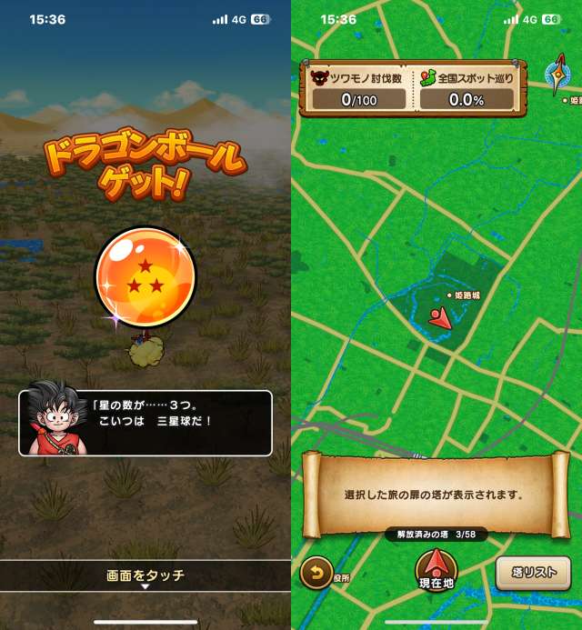 「旅の扉の塔」、「ツワモノ」、「ご当地スポット」「カメハウス(悟空モードのみ)」は、みんドラの情報共有マップで場所が確認可能です。ドラゴンボールの場所はレーダーの下の◯をタップで場所がわかります。人によって場所が異なるため、情報共有マップに対応する予定はありません。