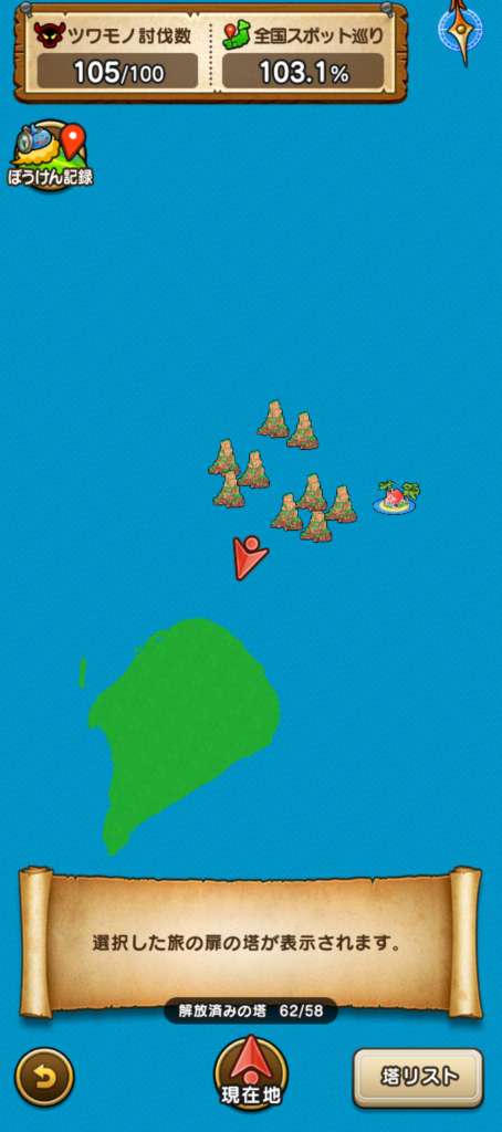 「旅の扉の塔」、「ツワモノ」、「ご当地スポット」「カメハウス(悟空モードのみ)」は、みんドラの情報共有マップで場所が確認可能です。ドラゴンボールの場所はレーダーの下の◯をタップで場所がわかります。人によって場所が異なるため、情報共有マップに対応する予定はありません。