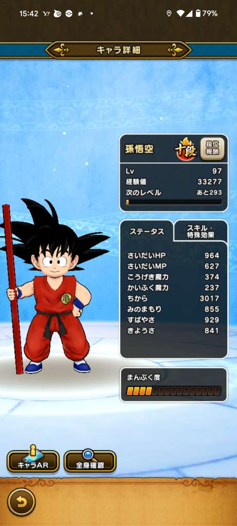 ちなみに孫悟空のレベル必要経験値はLv90を超えても一律300ポイントみたいなので岩山スポットだと20箇所、強敵だと30回※、祠だと10回※、メガモンだと6回※(※悟空参加)で1レベルupですね。