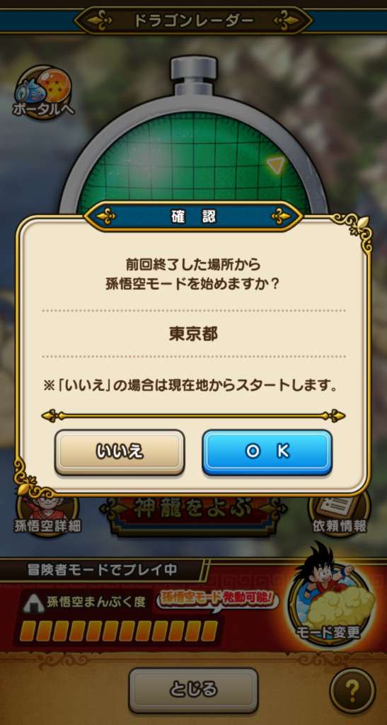 イベント期間中、ドラゴンレーダーから通常の「冒険者モード」→「孫悟空モード」へ切り替えることができます。