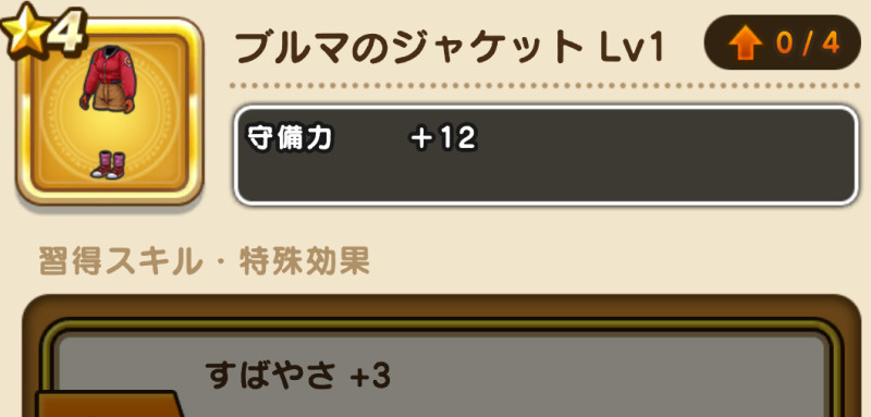 ドラクエウォークの防具「ブルマのジャケット」の評価や習得スキル・特殊効果をまとめています。