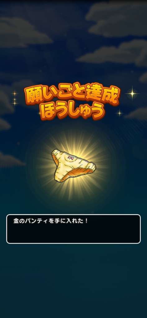 | 不老不死にしてくれ →ギャルのパンティおくれ!になる | ![]() 金のパンティ×1 |