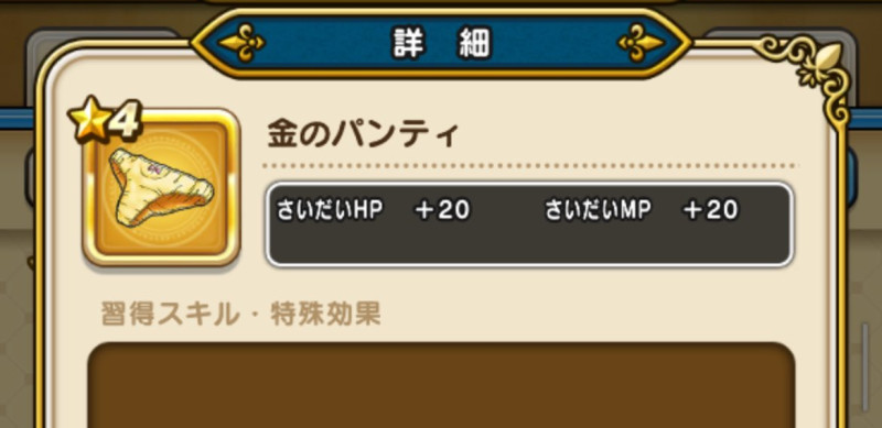ドラクエウォークの防具「金のパンティ」の評価や習得スキル・特殊効果をまとめています。