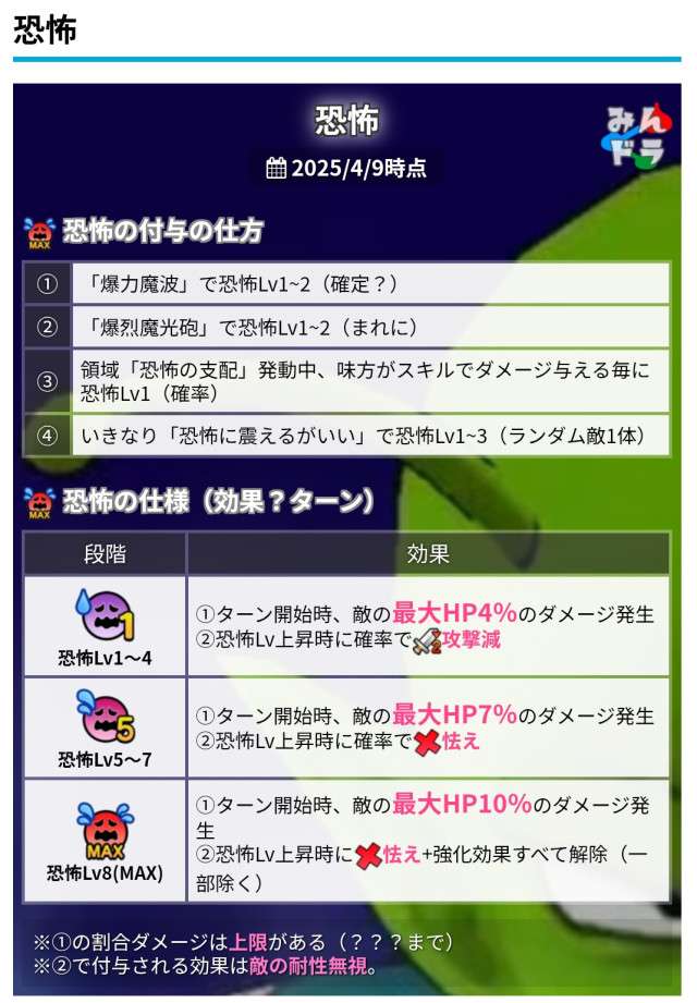 ![]() 恐怖Lv5~7 | ①ターン開始時、敵の最大HP7%のダメージ発生 ・ダメージ上限7万 ②恐怖Lv上昇時に確率で 怯え |