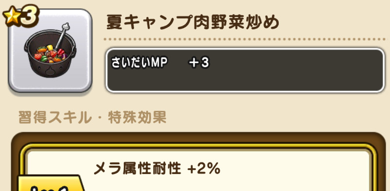 夏キャンプ肉野菜炒めの性能と習得スキル