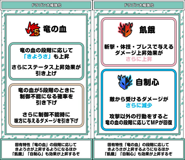 | 効果 | 「ドラゴン系」「???? 系」のこころの数だけ一部のステータスが上昇+HP&MP回復 |