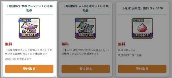 WEBストアオープンを記念して、星5武器確定ガチャの補助券(1回限り)やジェム100個の受け取りができます。ジェムは毎月貰えます。