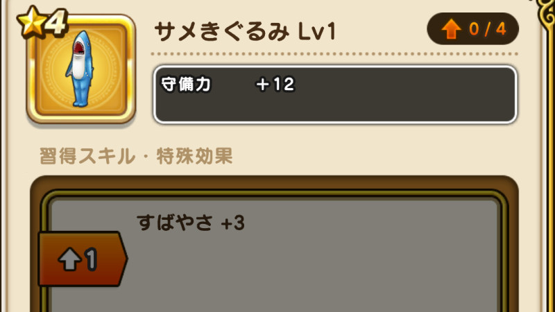 ドラクエウォークの防具「サメきぐるみ」の評価や習得スキル・特殊効果をまとめています。