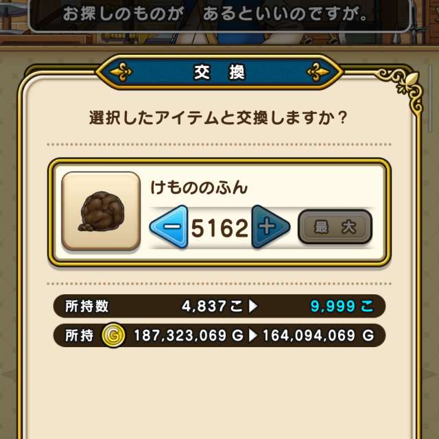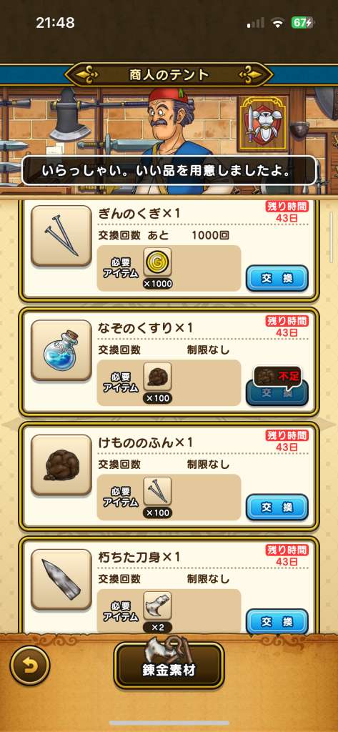 ぎんのくぎとけもののふんの交換が無制限になってます。詰んでしまってた方も先に進めるようになりましたね