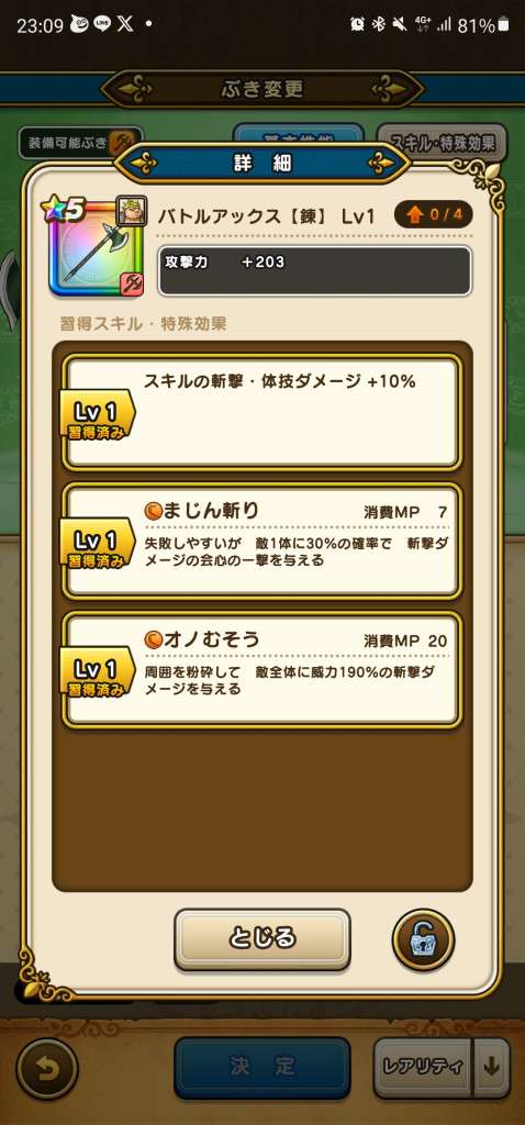元々は「まじんのオノ」に付いているスキルです。敵の攻撃呪文を低下させる効果があります。他に武器が潤沢にある方は火力は足りてると思いますので、状態異常/デバフの役割として選ぶのもいいと思い選びました。