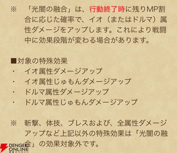 戦闘開始時に 最大MPの2%を消費し 消費量に応じて呪文ダメージを上げ さらに攻撃呪文使用時に必ずやまびこが発動する効果を自身に付与(効果4ターン)【いきなり】
