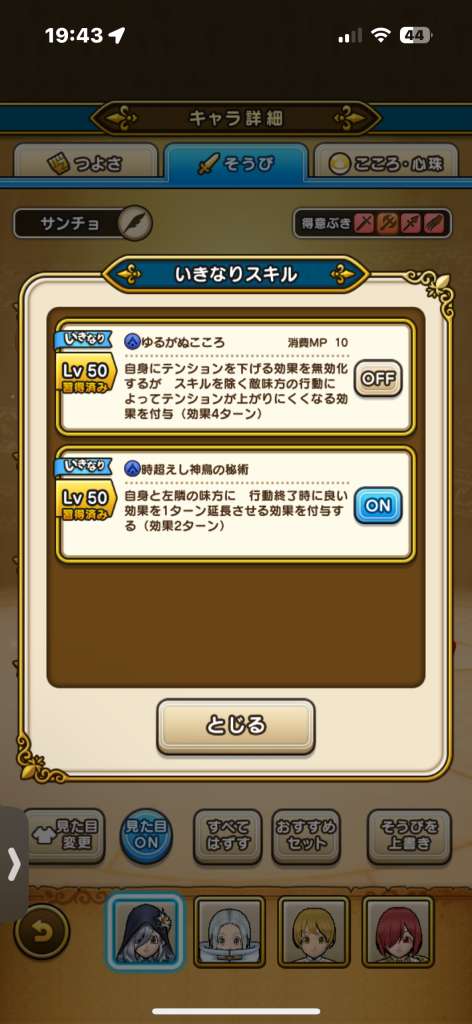 | Lv50 | ゆるがぬこころ / 消費MP 10 自身にテンションを下げる効果を無効化するが スキルを除く敵味方の行動によってテンションが上がりにくくなる効果を付与(効果4ターン)【いきなり】 |