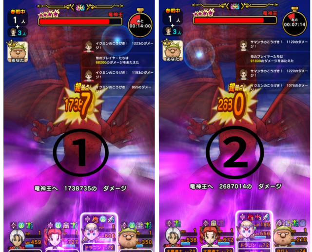 メガモン竜神王に何もスキル盛らず竜神王の杖ブレスで7~8万、適当に攻撃2段階UPで息を吸い込んだドラゴニックバーストで30万前後、それにスーパーハイテンションで70万辺り(スクショ失敗)