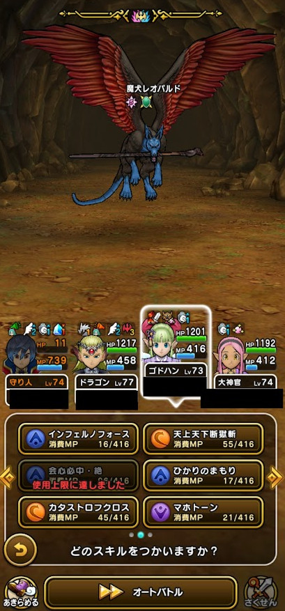 例えば初戦で会心必中絶を2回使うと、2戦目の魔犬戦ではもう使えません