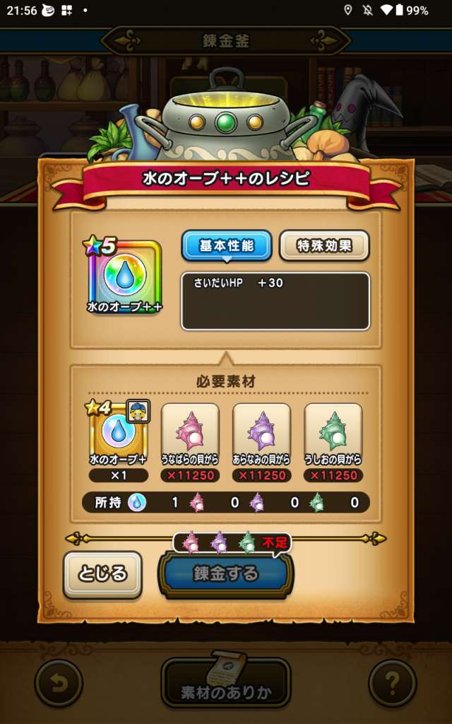 ![]() マーメイドハープ+ | ・さいだいHP+10、かいふく魔力+10 ・とくぎHP回復効果+3% ・即死耐性+10% |