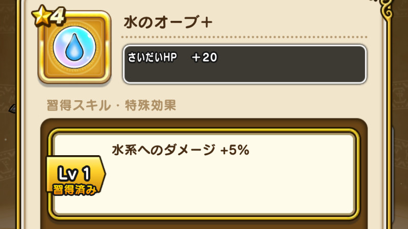 ドラクエウォークの防具「水のオーブ+」の評価や習得スキル・特殊効果をまとめています。
