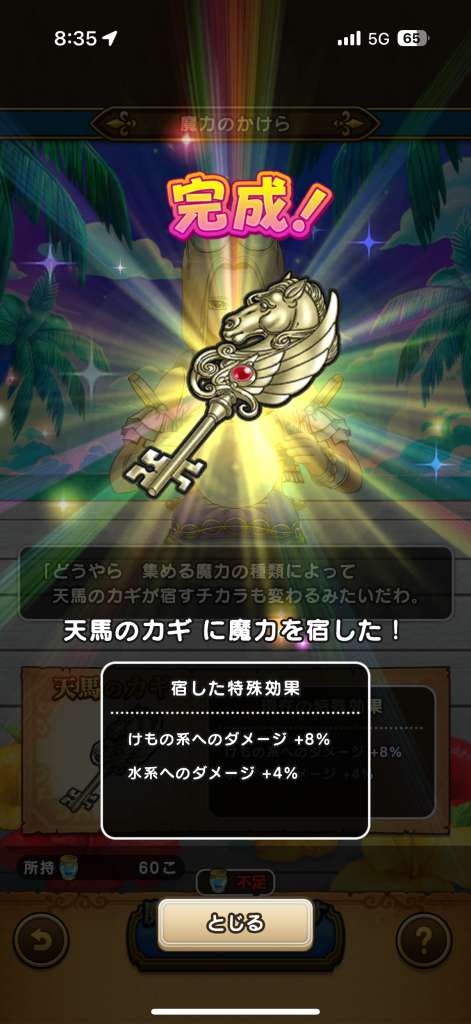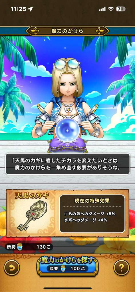 かけらを集めて、イベントポータルに入ると自動的に「天馬のカギ」の効果が変化します。「〇〇系へのダメージ+8%」、「〇〇系へのダメージ+4%」が理想です。