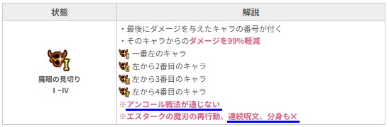 | ※①は、すべてのスキルに適応。 ※③は、消費MPがないスキルは発生しない。 ※②と③は、通常の暴走では反映されない ※継続ターンは、レベルが上昇したときにも更新される ※クシャラミの刻印[共有]の対象外。 |