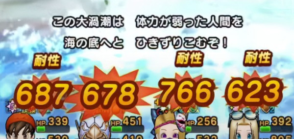 大渦潮で全体700ほどのダメージを受けていました。また、このスキルは消滅効果があるようです。