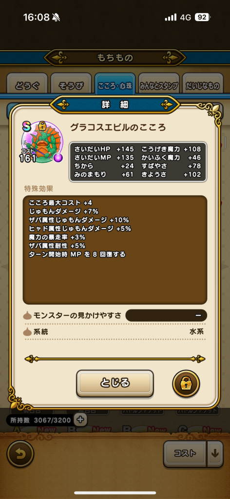 | こころ最大コスト+4 じゅもんダメージ+7% ザバ属性じゅもんダメージ+10% ヒャド属性じゅもんダメージ+5% 魔力の暴走率+3% ザバ属性耐性+5% ターン開始時MPを8回復する | ||||