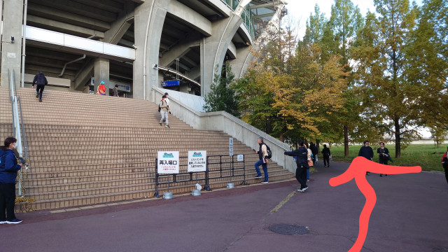 間違って階段を登ってスタジアムに入ってしまうとその先にFスポットへ向かう出口はなく無駄にスタジアム内を一周させられます(自分は無駄に一周しました)