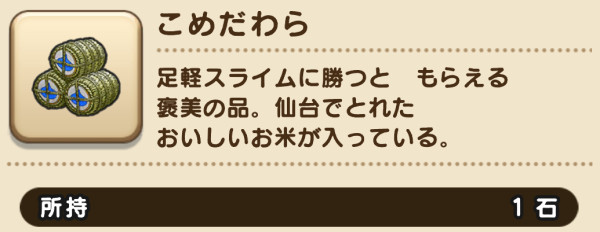 足軽スライム倒した後に、フィールドでこめだわら+1が表示されてますよ