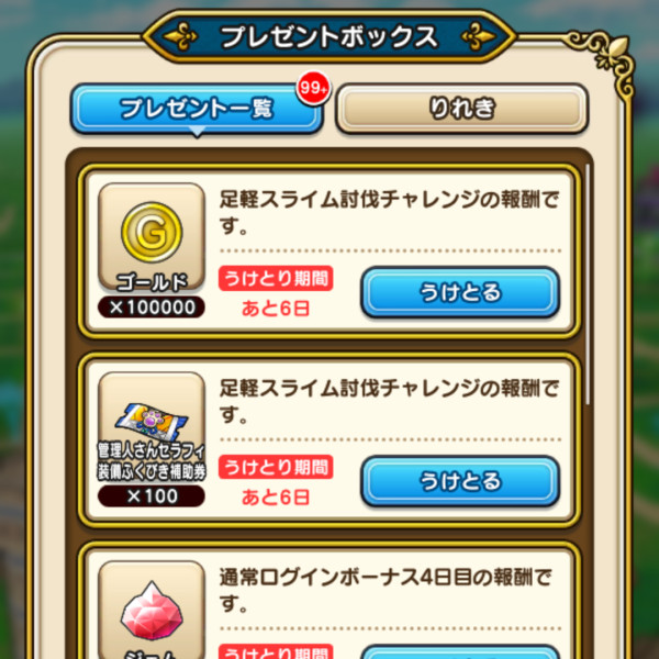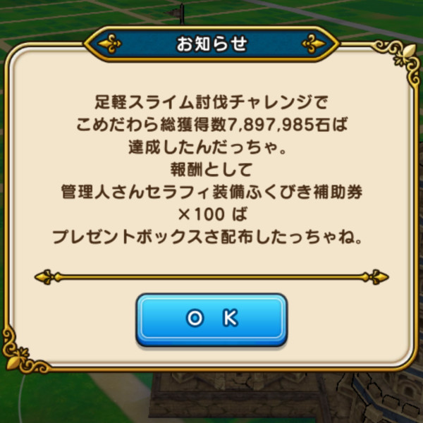 足軽スライム討伐チャレンジ報酬として、「管理人さんセラフィ装備ふくびき補助券×100枚」と「ゴールド」がプレゼントボックスに配布されました。ない方は、一度タイトルへ戻ることをおすすめします。