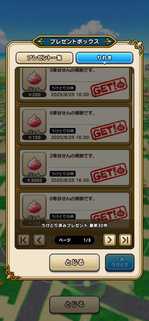 2025/8/25(月)15:00以降にログインすると演出が流れ、当選結果に応じたジェムがプレゼントボックスへ送られます。確認できない場合は、一度タイトル画面へ戻りましょう。