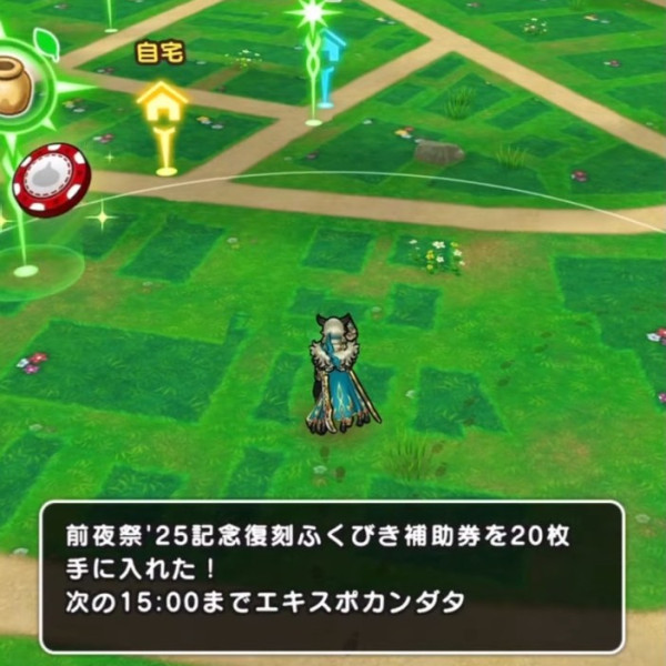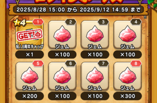 ![]() | 前夜祭'25記念復刻装備ふくびき補助券×300枚 ギガモン討伐報酬30000P:100枚 エキスポカンダタスポット:100枚 歩数ミッション41000歩:100枚 |