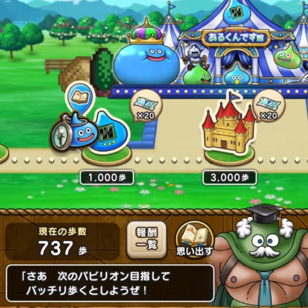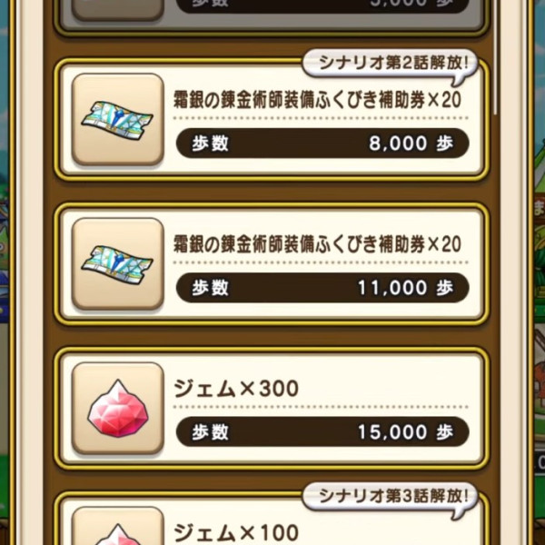 歩数に応じてジェムやふくびき補助券などの報酬が手に入ります。