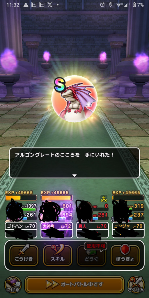 ニンジャ 絶美なる妖鞭+ヒプノ&タナトの心 素早さ900前後(メインアタッカー>ニンジャ>アルゴングレートの順に調整) 眠り+全状態異常成功率70%前後 悪状態変化成功率30%前後